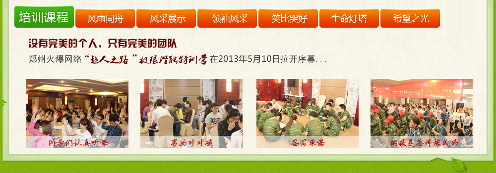 我來(lái)公司很幸運(yùn),剛進(jìn)公司兩天就趕上了公司每年才有一次的“鄭州火爆網(wǎng)絡(luò)2013年‘超人之路’極限潛能特訓(xùn)營(yíng)”的培訓(xùn)課程。