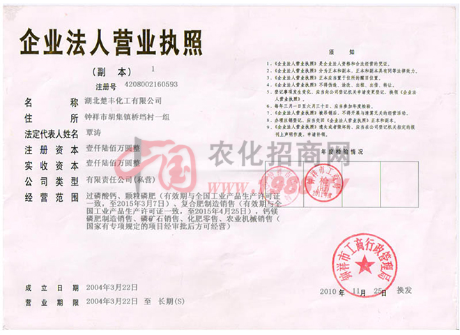 湖北楚豐化工有限公司成立于2004年,是一家集磷礦石開采、復(fù)合肥生產(chǎn)、銷售于一體的現(xiàn)代化股份制民營企業(yè)。公司注冊資本金人民幣1600萬元,占地面積18萬平方米,建筑面積3萬余平方米,擁有員工400多名(不含治國磷礦)。自有礦山、礦肥結(jié)合。