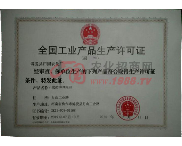 河南省博愛縣田園農(nóng)化廠成立于1999年3月,是農(nóng)業(yè)部農(nóng)藥定點生產(chǎn)企業(yè),坐落于博愛縣月山鎮(zhèn)工業(yè)路。
